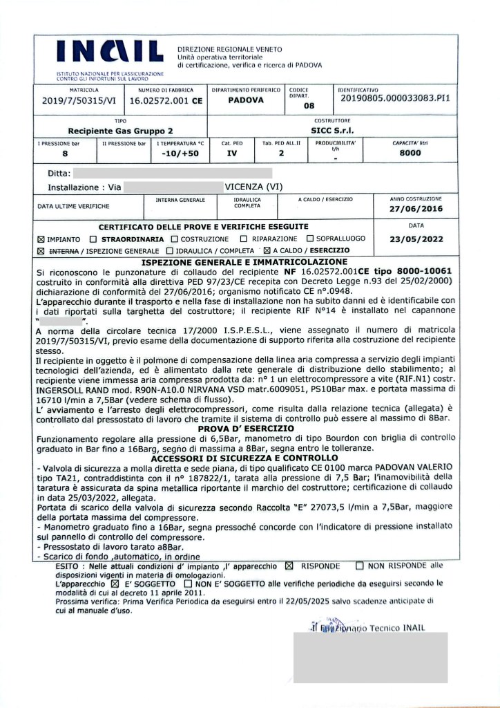 Come già descritto nei punti precedenti La VERIFICA DI PRIMO IMPIANTO detta anche VERIFICA DI MESSA IN SERVIZIO è una verifica una tantum che va richiesta all’INAIL e che solo l’INAIL può effettuare quando viene installata una nuova attrezzatura.